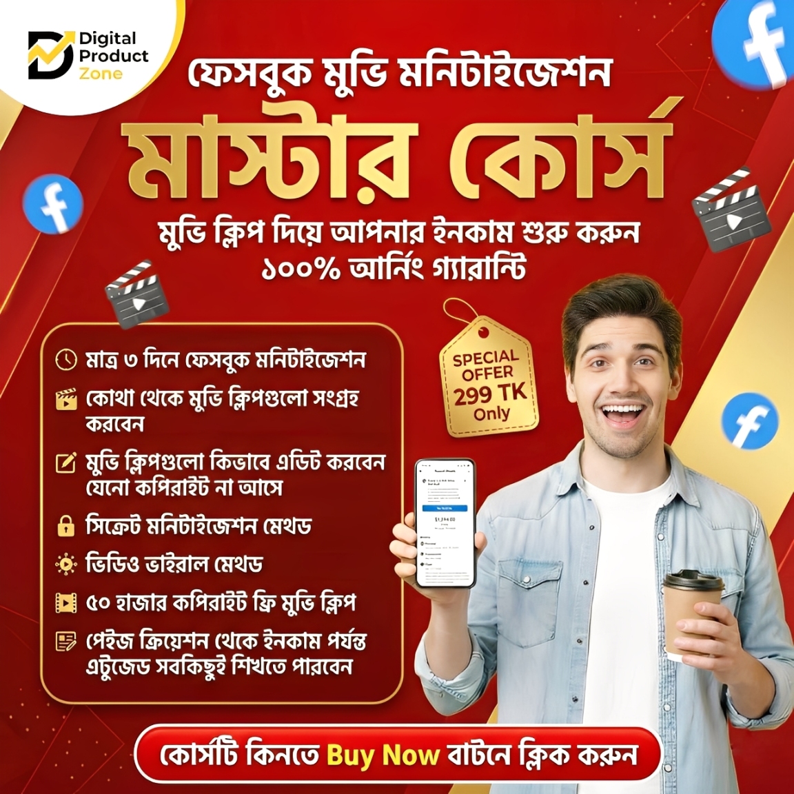 আমরা নিয়ে এসেছি ফেসবুক মুভি মনিটাইজেশন মাস্টার কোর্স।