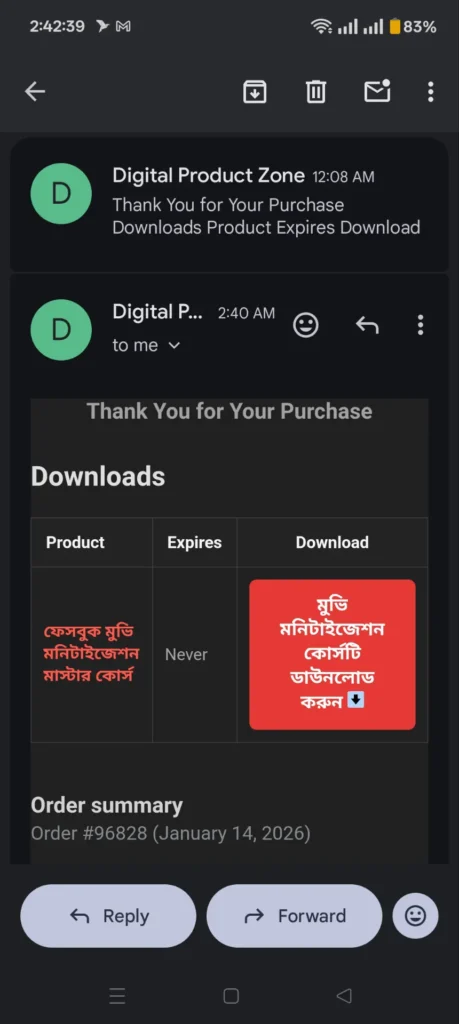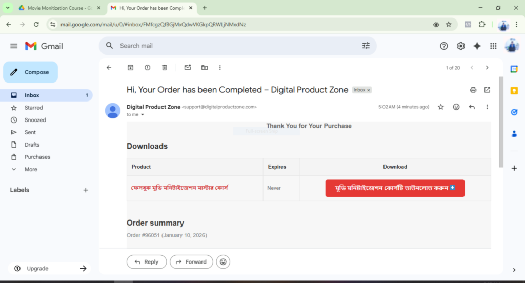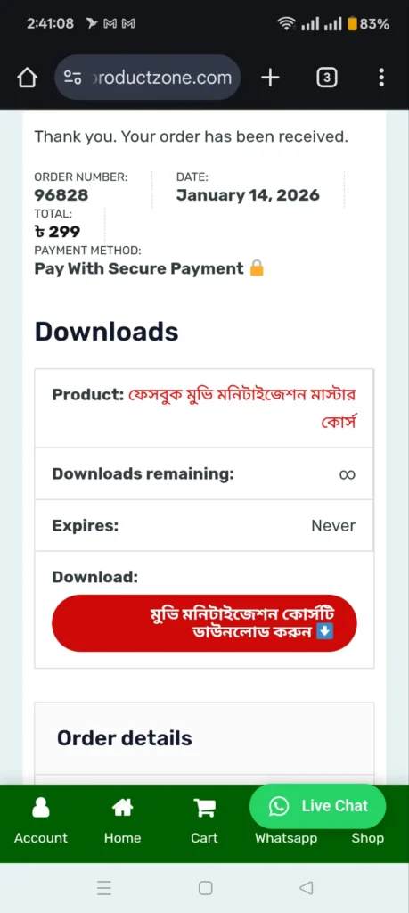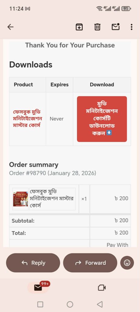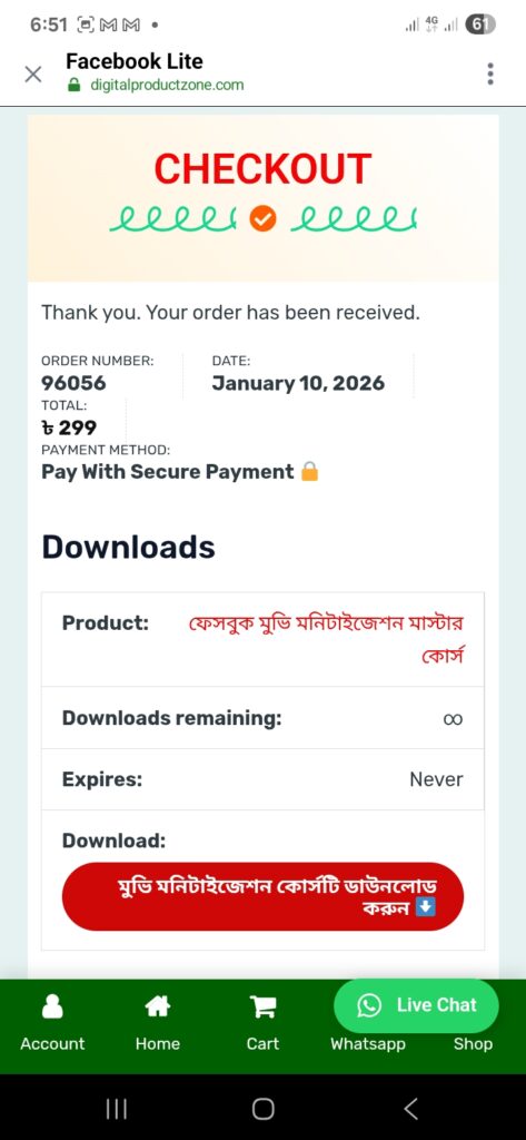 এত দ্রুত কোর্সটি পাবো ভাবতেই পারিনি। পেমেন্ট করার সাথে সাথেই কোর্সটি পেয়েছি। আশা করি কোর্সটি করে মুভি ক্লিপ দিয়ে মনিটাইজেশনের সবকিছুই শিখতে পারবো। ইনশাআল্লাহ
