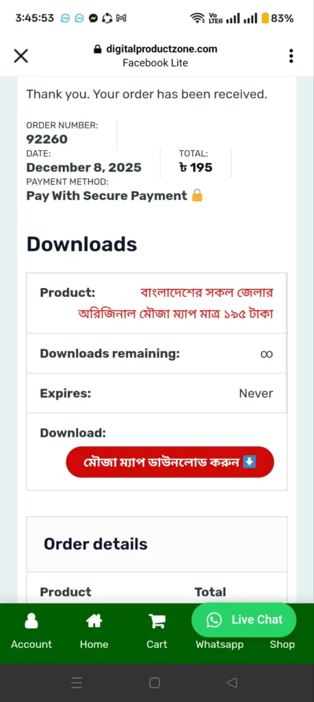 আলহামদুলিল্লাহ, আমি নিয়েছি পেমেন্ট কমপ্লিট হওয়ার ২ সেকেন্ডের ভিতরেই পেয়েছি মৌজা ম্যাপগুলো খুব সুন্দরভাবে গুগল ড্রাইভ এ সাজানো আছে।